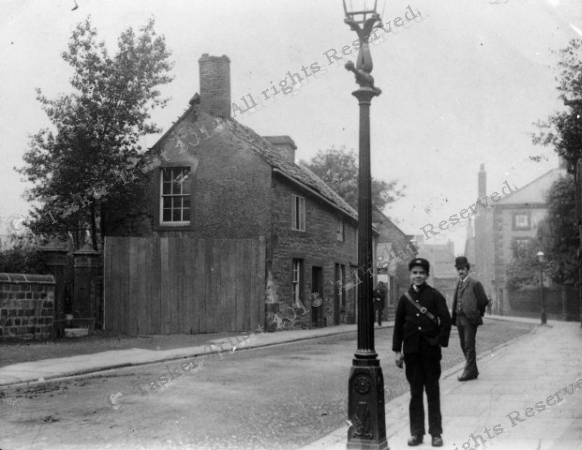 A telegraph boy smiles at the photographer in this early c.1900 image, dressed in his official uniform and carrying a bag of messages. Behind him a smartly-dressed man in a bowler also poses failry casually towards the camera. This upper part of the street included a row of old stone cottages, seen here on the left, dating from c.1800. The original sash windows with two by six panes are clearly visible. Also see E.G.Tasker's 'Barnsley Streets': vol 1 pp54-55.