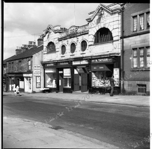 A 1960 view of the Globe Cinema when the integrated shops in the frontage were occupied by H.H.Ellis (dressmakers), Delicatessen and H.Taylor's toys. Also see image EGT804.