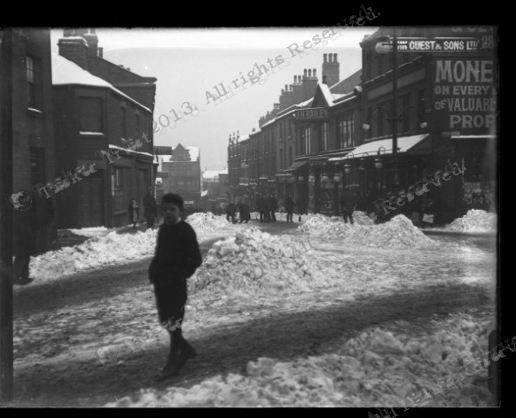 Looking down New Street after a heavy fall of snow. The photographer has been careful to include the boy in the front of the image, so as to add a sense of interest and perspective; and also in the distance the gathering crowd people in the middle of the street. A prominent landmak business, Guest's clothing/ boot & shoe/pawnboking emprorium can be seen on the right. Piles of snow, cleared from pavements dominate the street.