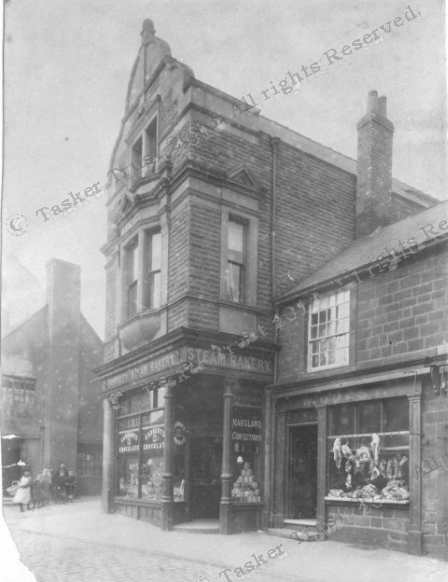 Shambles Street got its ancient name from the butchers' stalls that were set up at the busy entrance to the street (from Market Hill/Church Street) on market and fair days. A narrow street at the junction, it widened and formed a major routeway into and out of town, known as Westgate or West Way (not to be confused with the other Westgate Barnsley street name). Here at number 35 we can see a butcher's shop, Guest's, joints hanging in the window and outside! Not something that would be allowed these days! The projecting building at 37 is Sam Marsland's Steam Bakery and confectioners. This image dates from about 1898 when Marslands operated. Sam was a keen swimmer and a Barnsley police Swimming instructor, quite a character by all accounts.