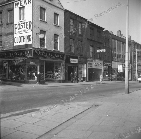 Foster brothers' clothing shop occupied a prominent corner position at number 17, its presence doubly emphasized by the advertising opportunity at the upper side of the building. Established here as early as 1897, the business continued until 1977, so well over a century of trade. Next to it, The Manshop (15A) attempted to compete but was empty at the time of this 1960 photograph; and also visible is the old butcher's shop of C. Hawke (1893-1962) and the relatively short-lived Don Valley Cleaners (1958-62) at 13B.