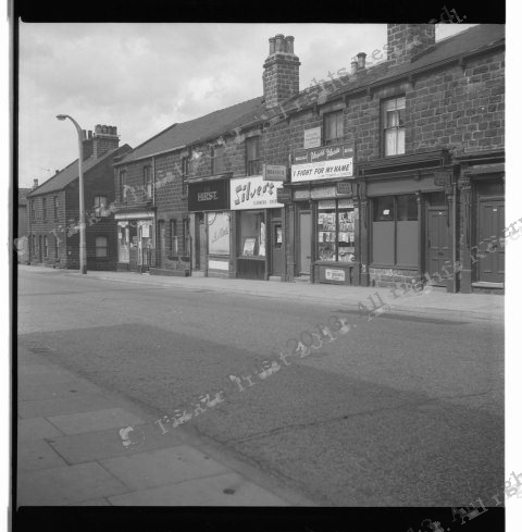 The small corner shop in the distance (by King Street) was formerly a BBCS branch. Albert Hirst, butcher, was in business at 92 from 1949-1967, with many local regulars as well as a passing trade. Silvers Cleaners, at 94, were also long-established, here from 1936 to 1962. Lowe the newsagent was next door at 96, 1948-1962, soon replaced by Crossley and newsagents were on this site from 1903. Claton's betting shop was here from 1961-1970.