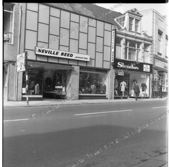 Neville Reed, 'personal tailor' were here (at 15-17) from 1968-69, the entire facade matching the 1960s trend of simple design frontages for shops; they were succeeded by another menswear business, John Temple. The Slendos Gowns shop (no.13) were on this site longer, 1966-76, their building much more traditional, at least its Edwardian first floor exterior.